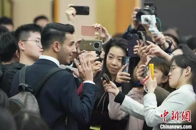 3月7日,跳过网红舞蹈“科目三”的中阿卫视记者方浩明在记者会后引发媒体关注。中新社记者 崔楠 摄
